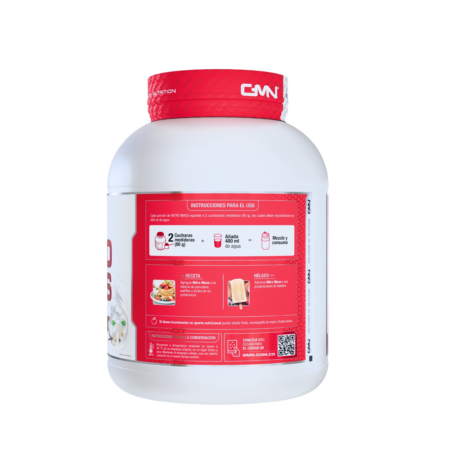 Preparación: Cada porción de NITRO MASS equivale a 2 cucharas medidoras (80 g), las cuales deben reconstruirse en 480 ml de agua.