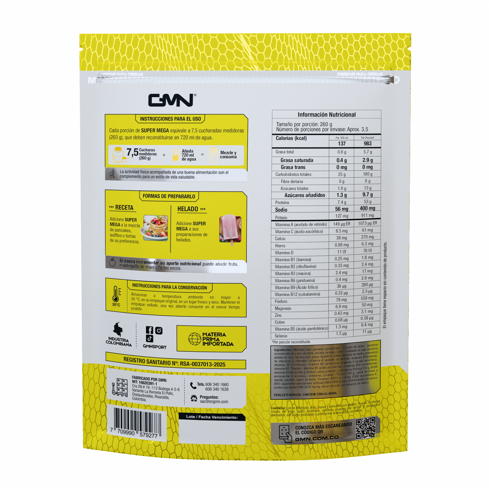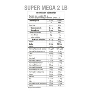 Preparación: Cada porción de SUPER MEGA equivale a 7,5 cucharadas medidoras (260 g), que deben reconstruirse en 720 ml de agua.